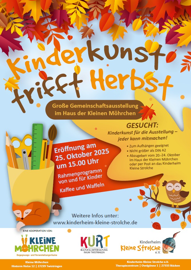 Kinderheim Kleine Strolche https://kinderheim-kleine-strolche.de/ Wed, 01 Oct 2025 07:09:03 +0000 de hourly 1 https://wordpress.org/?v=6.8.3 Kinderkunst trifft Herbst https://kinderheim-kleine-strolche.de/kinderkunst-trifft-herbst Tue, 30 Sep 2025 15:02:00 +0000 https://kinderheim-kleine-strolche.de/?p=10296 Kinderkunst trifft Herbst Große Gemeinschaftsausstellung im Haus der Kleinen Möhrchen in Twistringen Twistringen/Asendorf, September 2025 – Das Kinderheim Kleine Strolche lädt gemeinsam mit dem Haus der Kleinen Möhrchen e.V. und dem KURT e.V. ganz Twistringen und umzu herzlich zur großen Ausstellungseröffnung am 25. Oktober 2025 ein. Unter dem Motto „Kinderkunst trifft Herbst“ und der Schirmherrschaft…